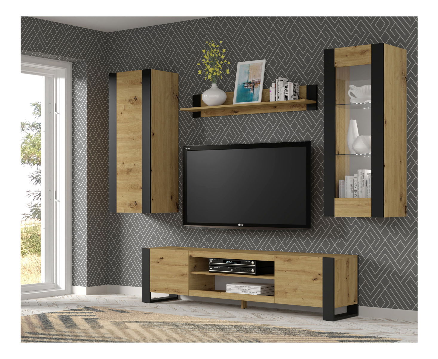 Dub artisan + čierna matná + sklo