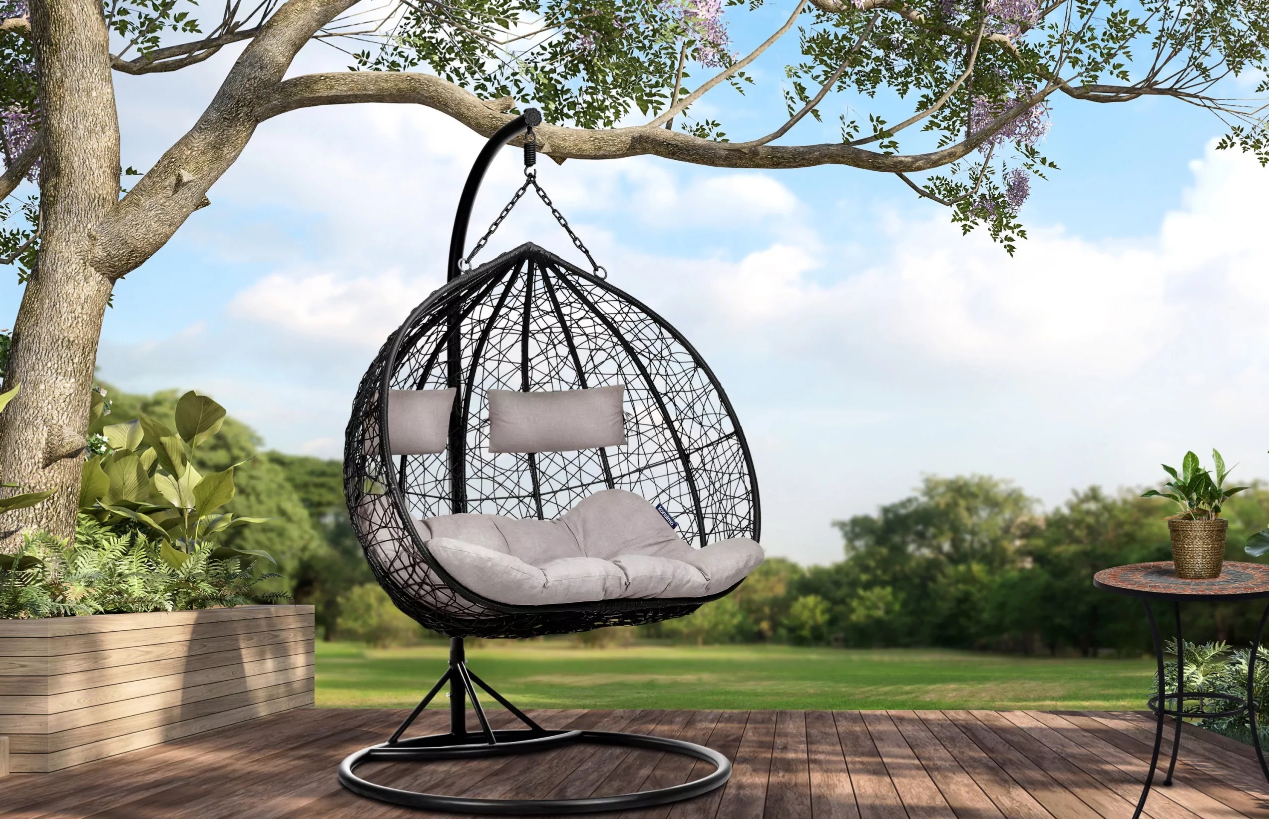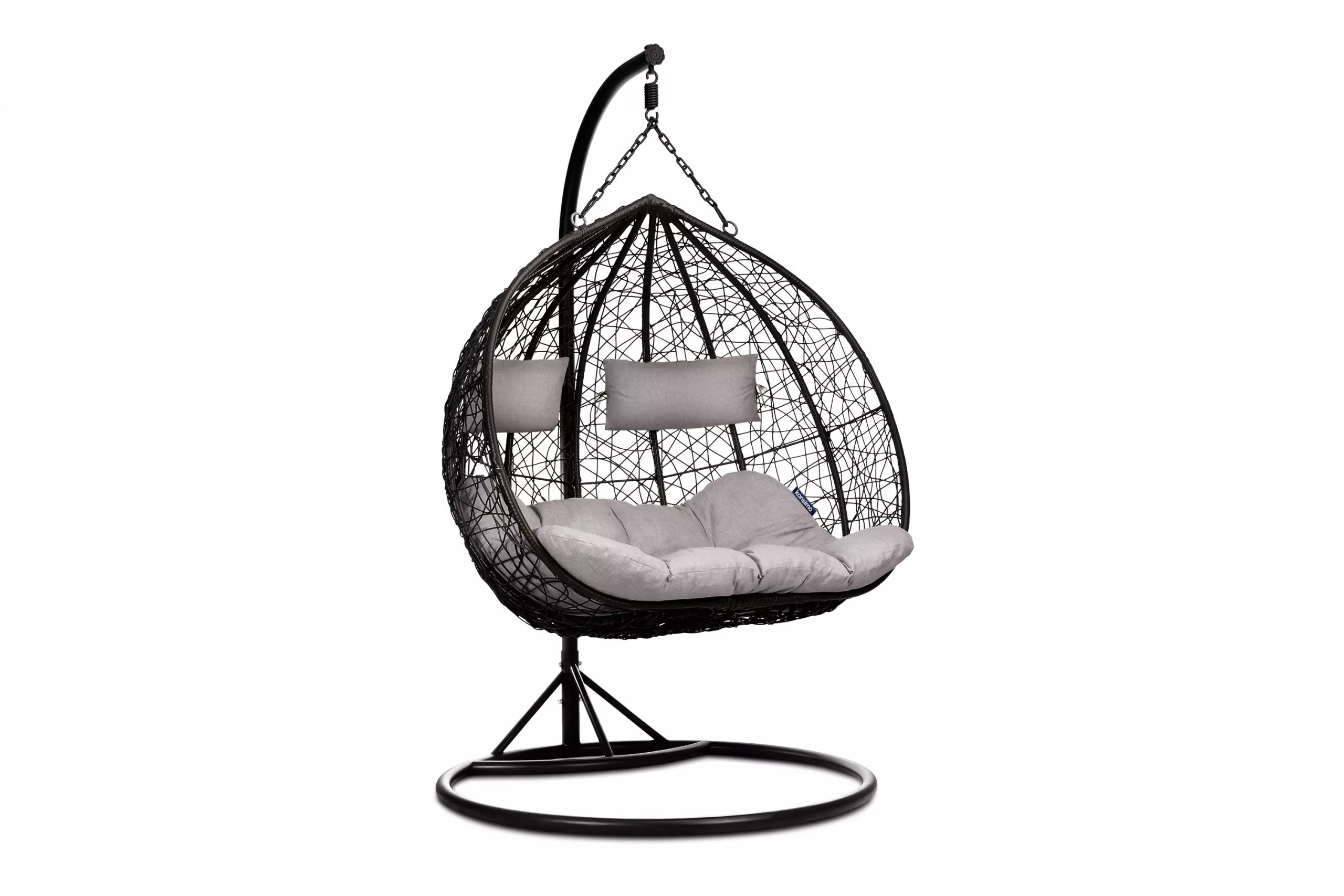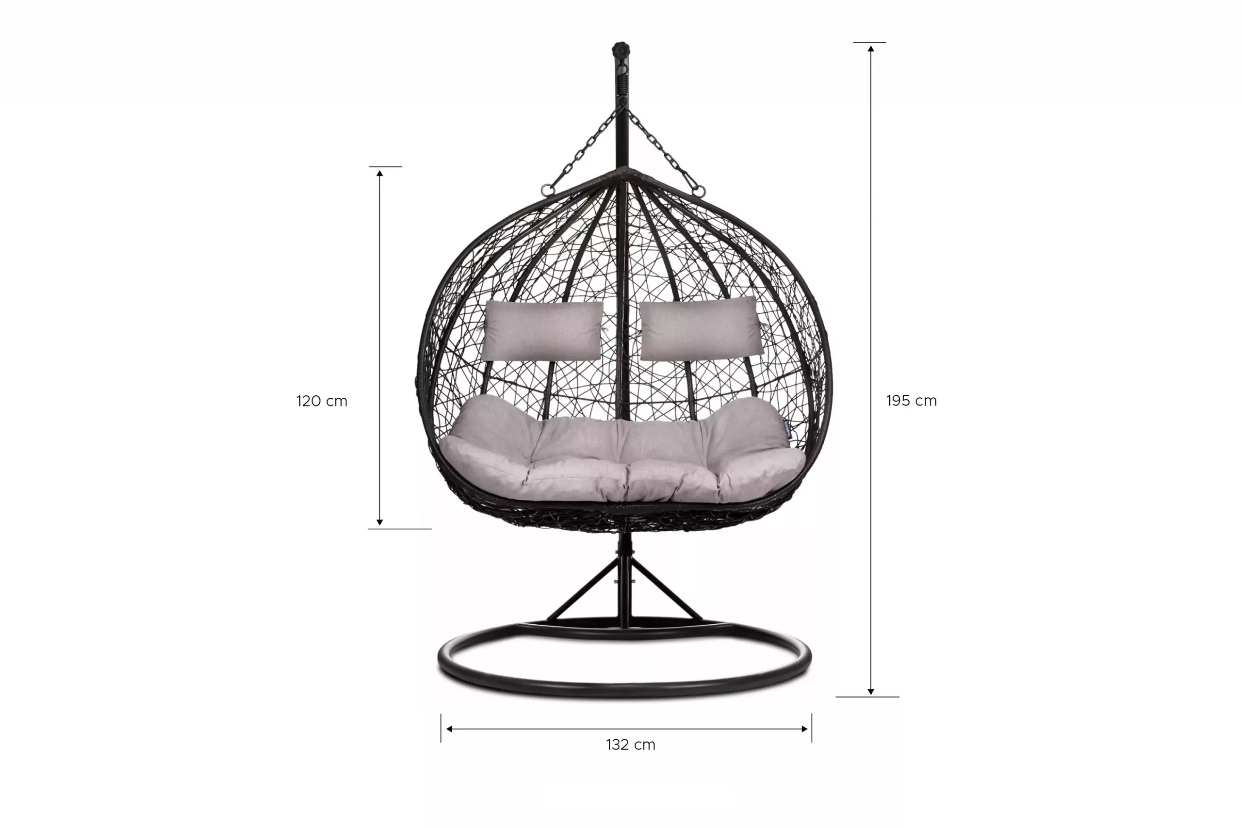 Závesné dvojkreslo Cleopatra v sivých odtieňoch je elegantné ratanové kreslo, ideálne pre záhradu alebo terasu. Jeho pohodlie a tvar poskytujú dokonalé miesto na oddych. Materiál kresla je technoratan, kov a tkanina s antialergickou výplňou HCS z polyesteru a silikónových guličiek. Tento materiál je vysoko odolný proti oderu. Maximálne zaťaženie kresla je 130 kg. Nohy sú vyrobené z kovového rámu. Priemer rámu a výška rámu sú štandardné. Hlavný ratanový zväzok je hrubý 1,2 cm. Tento nábytok je odolný voči poveternostným vplyvom a súčasťou produktu sú vankúše, ktoré je možné umývať v tlakovej umývačke.