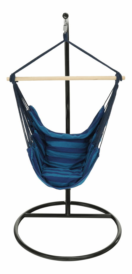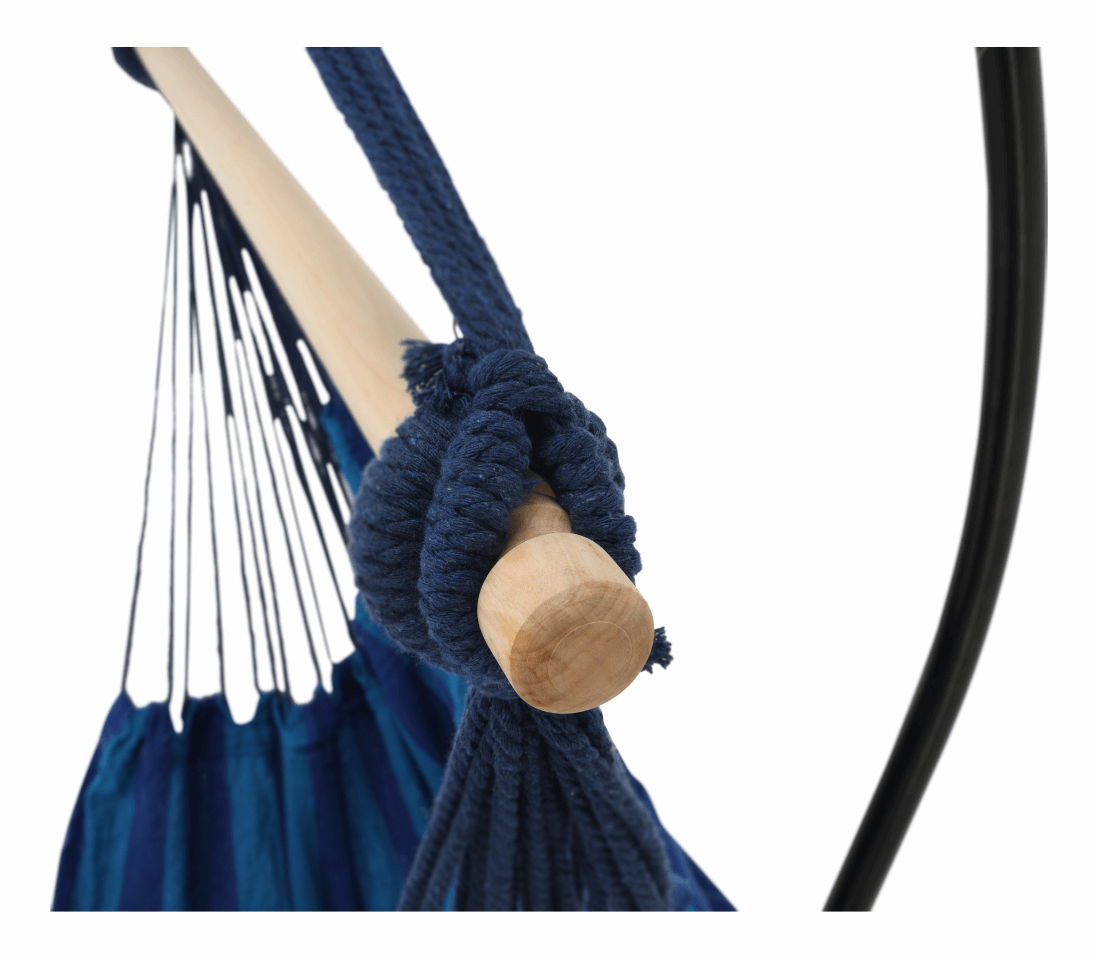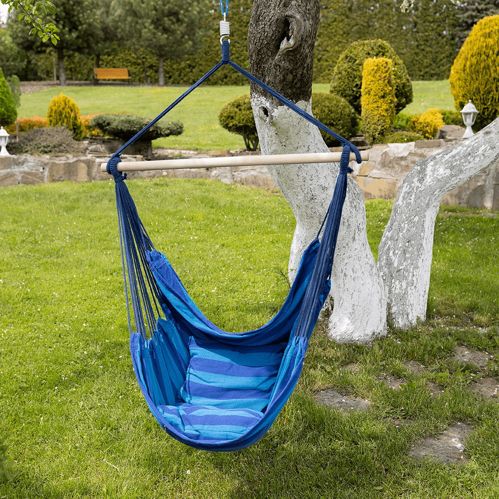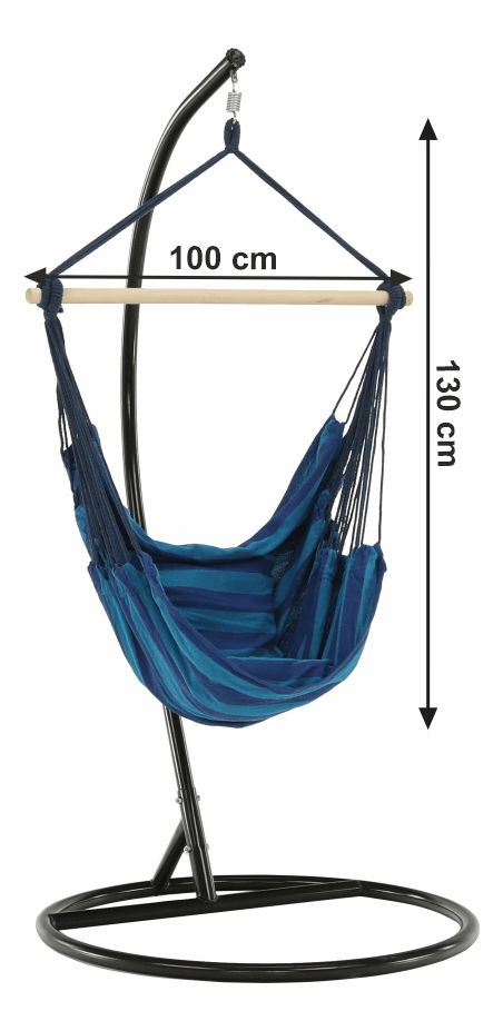 Závesné hojdacie kreslo Nicolaj (modrá) s výškou 130 cm je ideálnou voľbou pre každého, kto si chce užiť relax na čerstvom vzduchu alebo v interiéri svojho domova. Toto kreslo je vyrobené z kvalitného materiálu pozostávajúceho z 50% bavlny a 50% polyesteru a má nosnosť až 120 kg. Rozmery tohto kresla sú 100x130 cm. Kreslo je modrej farby a dodáva sa s drevenou tyčou, 2x vankúšom a kreslom samotným. Stojan ani pružina však nie sú súčasťou balenia. Kreslo je špeciálne obšité a vhodné do interiéru aj exteriéru. Produkt sa dodáva v demonte. S týmto závesným hojdacím kreslom si užijete maximálny komfort a oddych vďaka jeho kvalitnému spracovaniu a materiálom.