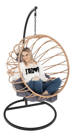 Závesné kreslo Gimun v čiernom a prírodnom prevedení je ideálne na úplný odpočinok, či už v interiéri alebo exteriéri. Toto romantické kreslo kombinuje pohodlie s elegantným dizajnom a ponúka maximálny komfort, ktorý oceníte pri pohojdávaní sa a čítaní dobrej knihy. Vyskúšajte relax, ktorý ponúka závesné kreslo Gimun vyrobené z umelého ratanu prírodnej farby. Tento materiál je odolný voči poveternostným podmienkam, čo z neho robí vhodnú voľbu pre exteriéry aj interiéry. Stojan kresla je vyrobený z kovu v čiernom prevedení a kreslo je doplnené o pohodlné vankúše. Výška sedu je 30 cm a hĺbka sedu je 80 cm. Závesné kreslo Gimun má nosnosť až 90 kg. Užite si dokonalý oddych v romantickom kresle Gimun.