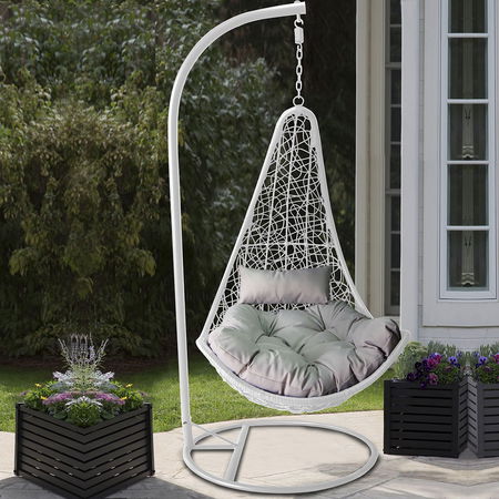 Závesné záhradné kreslo, ktoré je vyrobené z odolného plastu. Rám kresla je vyrobený z kovu, čo zaručuje jeho odolnosť a bepečnosť. Záhradné kreslo je vybavené mäkkým vankúšom.