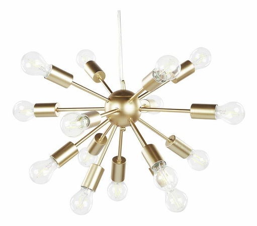 Zvýraznite svoju obývačku alebo jedáleň týmto závesným svietidlom inšpirovaným glamom. Je vyrobený zo železa a pýši sa zlatým povrchom, ktorý dodá každému interiéru teplý nádych. Jeho charakteristický dizajn vytvorený z 15 dekoratívnych žiaroviek, ktoré poskytujú dokonalú príležitosť predviesť ich estetiku a zároveň plne osvetliť miestnosť.