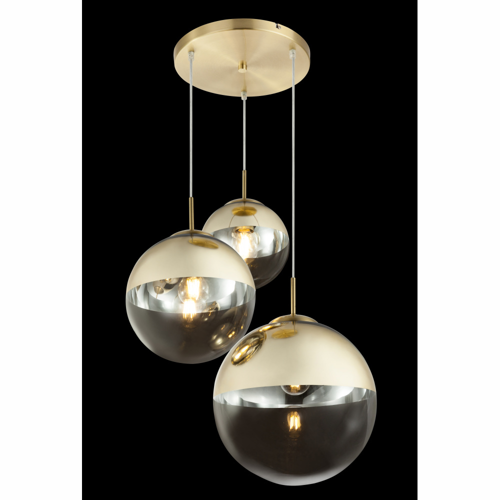 Závesné svietidlo kov - zlato, pozlátené číre sklo, 3 gule s D: 20 - 25 - 30 cm, D: 510, H: 1200, bez 3xE27 40W 230V.