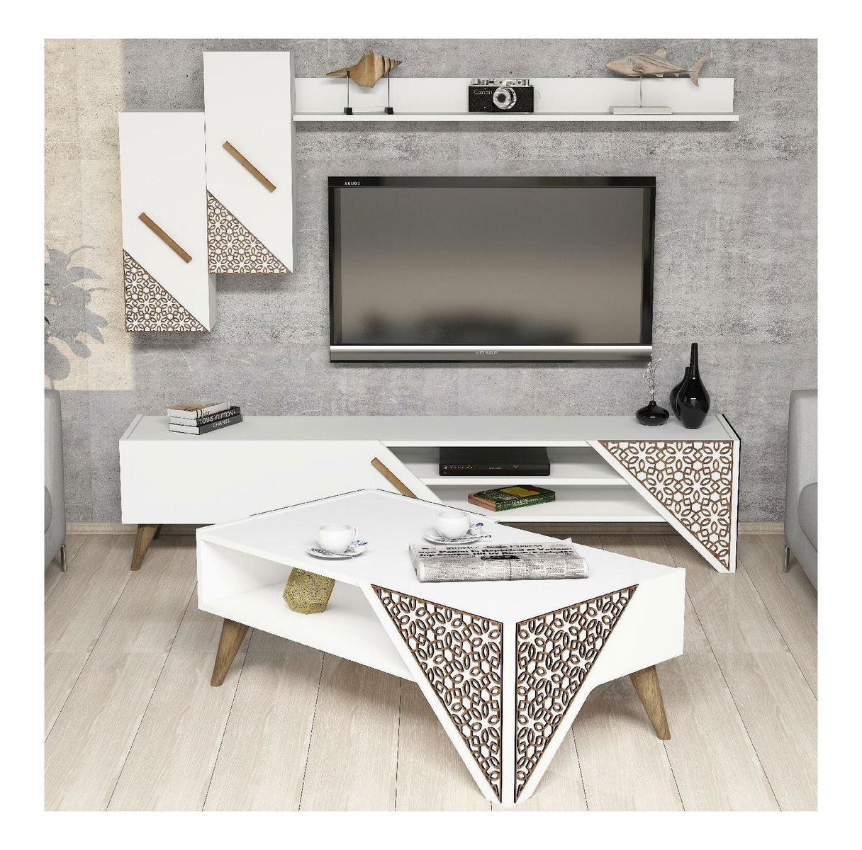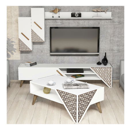 hrúbka: 18 mm, 4 mm, cnc reliéfne plastové nohy, veľkosť TV jednotky: šírka: 180 cm, výška: 40 cm, hĺbka: 37 cm, 2-poschodový konferenčný stolík veľkosť: šírka: 105 cm, výška: 40 cm, hĺbka: 58,2 cm, výška police: 16,1 cm, veľkosť nástennej police: šírka: 120 cm, výška: 11,8 cm, hĺbka: 16,1 cm, veľkosť skrinky: šírka: 26,4 cm, výška: 63 cm, hĺbka: 22 cm