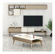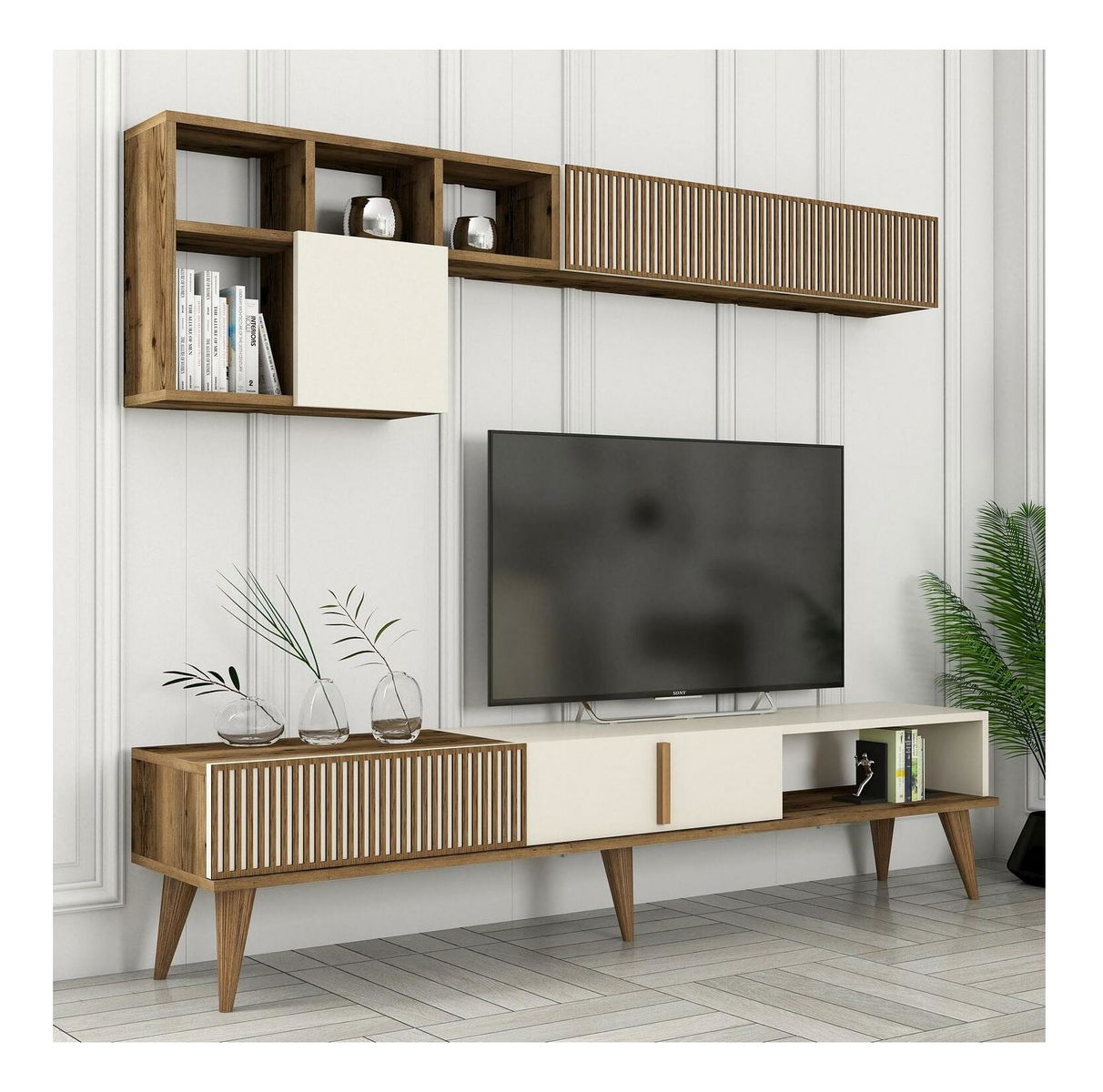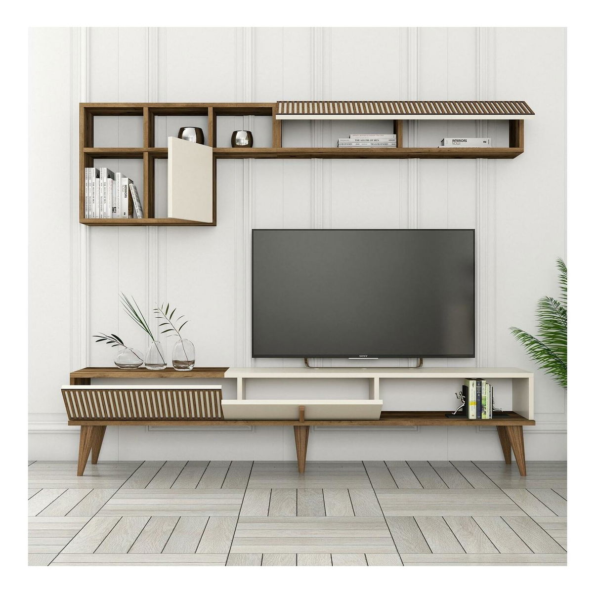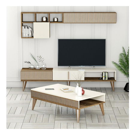 Zostava nábytku Millano 1 v kombinácii orechovej a krémovej farby prináša do obývacej izby moderný a funkčný štýl. Táto sada, ktorá obsahuje modernú TV skrinku, závesnú skrinku a konferenčný stolík, ponúka množstvo úložného priestoru na knihy, dekorácie či multimediálne zariadenia.