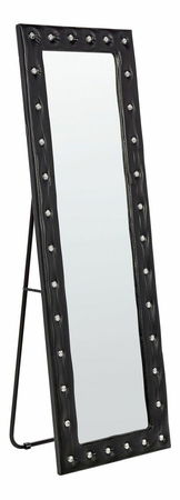 Toto štýlové stojacie zrkadlo premení vašu spálňu na elegantný priestor. Zrkadlo s precíznou ručnou výrobou je čalúnené kvalitnou látkou podobnou umelej koži, ktorú dopĺňajú ozdobné sklenené kamienky. Stane sa očarujúcou dekoráciou akejkoľvek miestnosti zariadenej či už v modernom alebo boho štýle. Vďaka kovovému stojanu ho možno umiestniť kamkoľvek. Pomocou háčikov na zadnej strane ho možno horizontálne alebo vertikálne zavesiť aj na stenu.