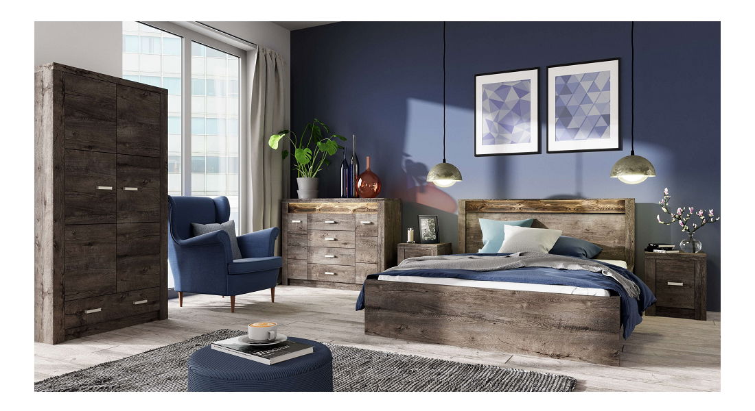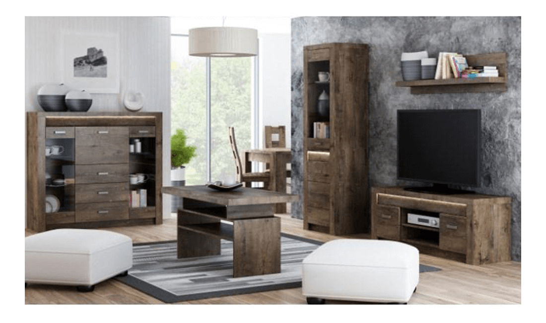 Luxusný sektorový nábytok vysokej kvality v masívnom dizajne s prvkami surového maľovaného dreva a výraznou reliéfovou kresbou, s efektívnym LED podsvietením, vhodný na zariadenie obývacích izieb a jedální, korpus hrubý až 48 mm, úchytky kovové. Možnosť dokúpenia LED osvetlenia. Materiál: DTD laminovaná, ABS hrany
