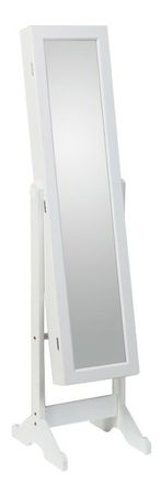 Vysoké a nastaviteľné zrkadlo stojace na stabilných nohách. Vyniká doplnkovým úložným priestorom na bižutériu, má príťažlivú bielu farbu. Materiál je MDF.